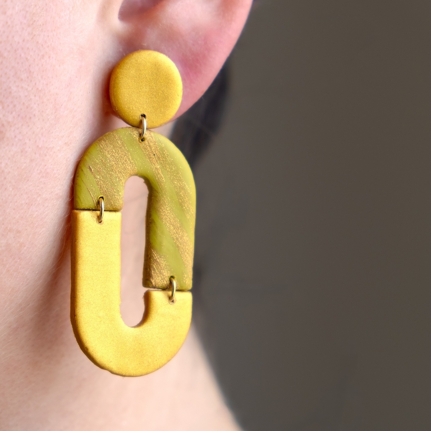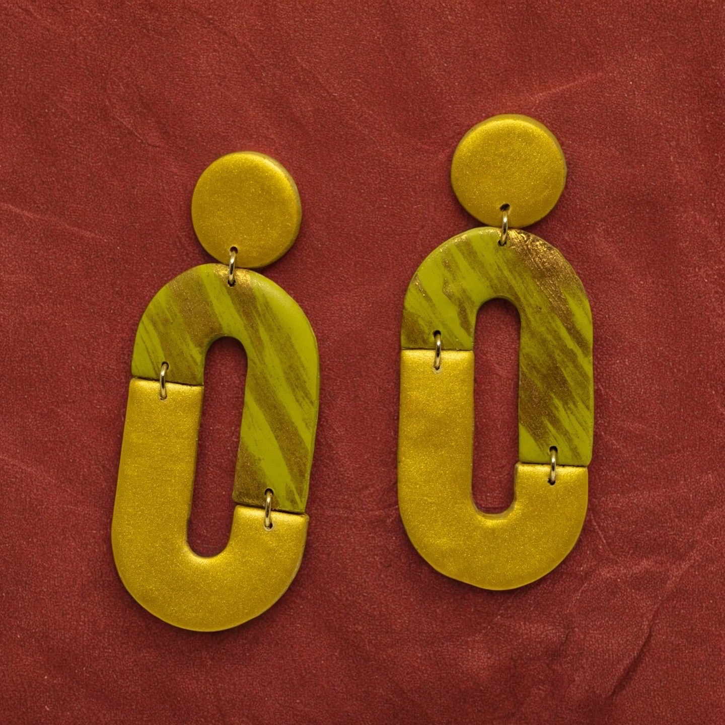Tarzınızı tamamlayacak, el yapımı ve benzersiz tasarımıyla öne çıkan altın detaylı modern küpeler, şıklığın en iddialı hali! Zincir halkalarından ilham alınarak tasarlanan bu küpeler, altın sarısı ve doğal yeşil tonlarının mükemmel uyumuyla dikkat çekiyor. Hafif yapısı sayesinde gün boyu rahatlıkla kullanabilir, minimal ama etkileyici bir görünüm elde edebilirsiniz.